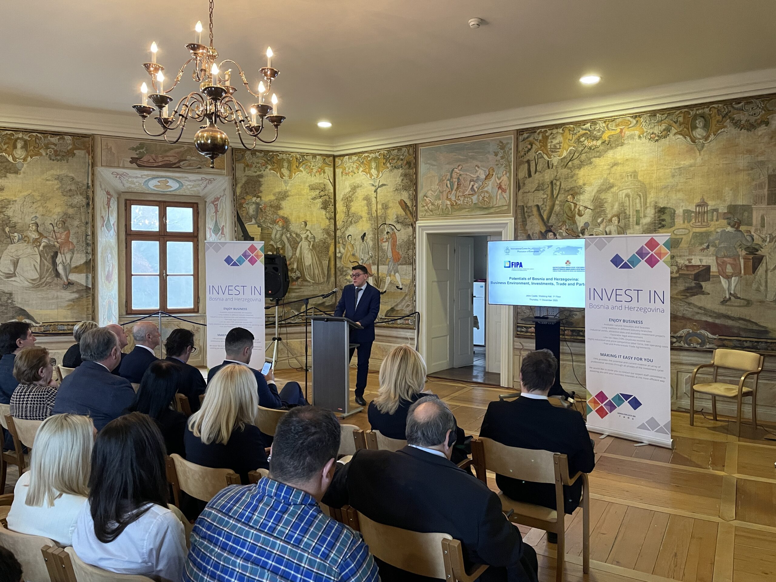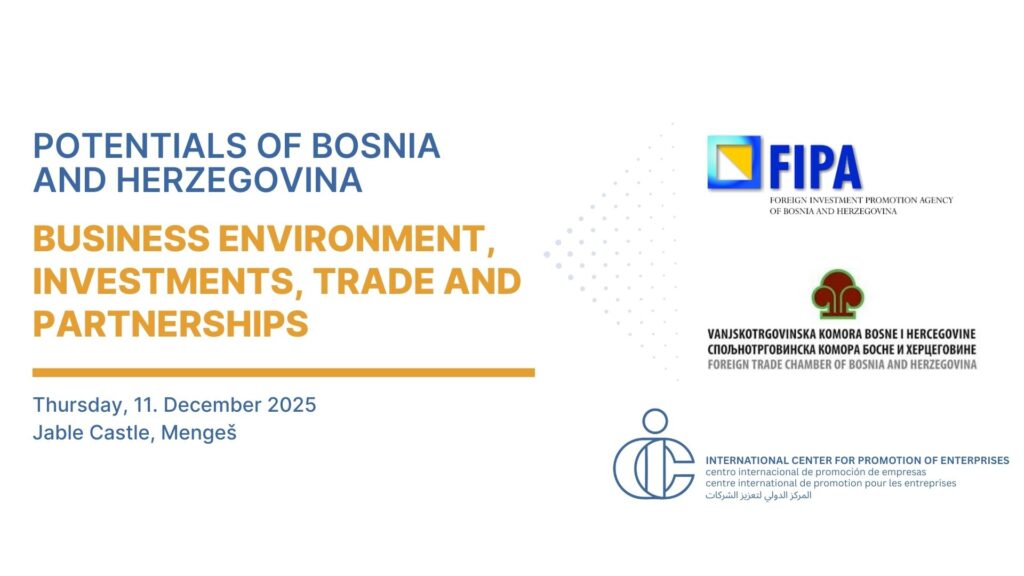 On Thursday, 11 December 2025, the International Center for Promotion of Enterprises (ICPE), in cooperation with its partners the Foreign Investment Promotion Agency of Bosnia and Herzegovina (FIPA) and the Foreign Trade Chamber of Bosnia and Herzegovina (FTC), hosted the event “Potentials of Bosnia and Herzegovina: Business Environment, Investments, Trade and Partnerships” at Jable Castle in Mengeš. The event brought together representatives of governmental institutions, investment support organisations, companies and students of International Business, providing a platform for exchange on economic cooperation and partnership opportunities related to Bosnia and Herzegovina.Lorem ipsum dolor sit amet, consectetur adipiscing elit. Ut elit tellus, luctus nec ullamcorper mattis, pulvinar dapibus leo.